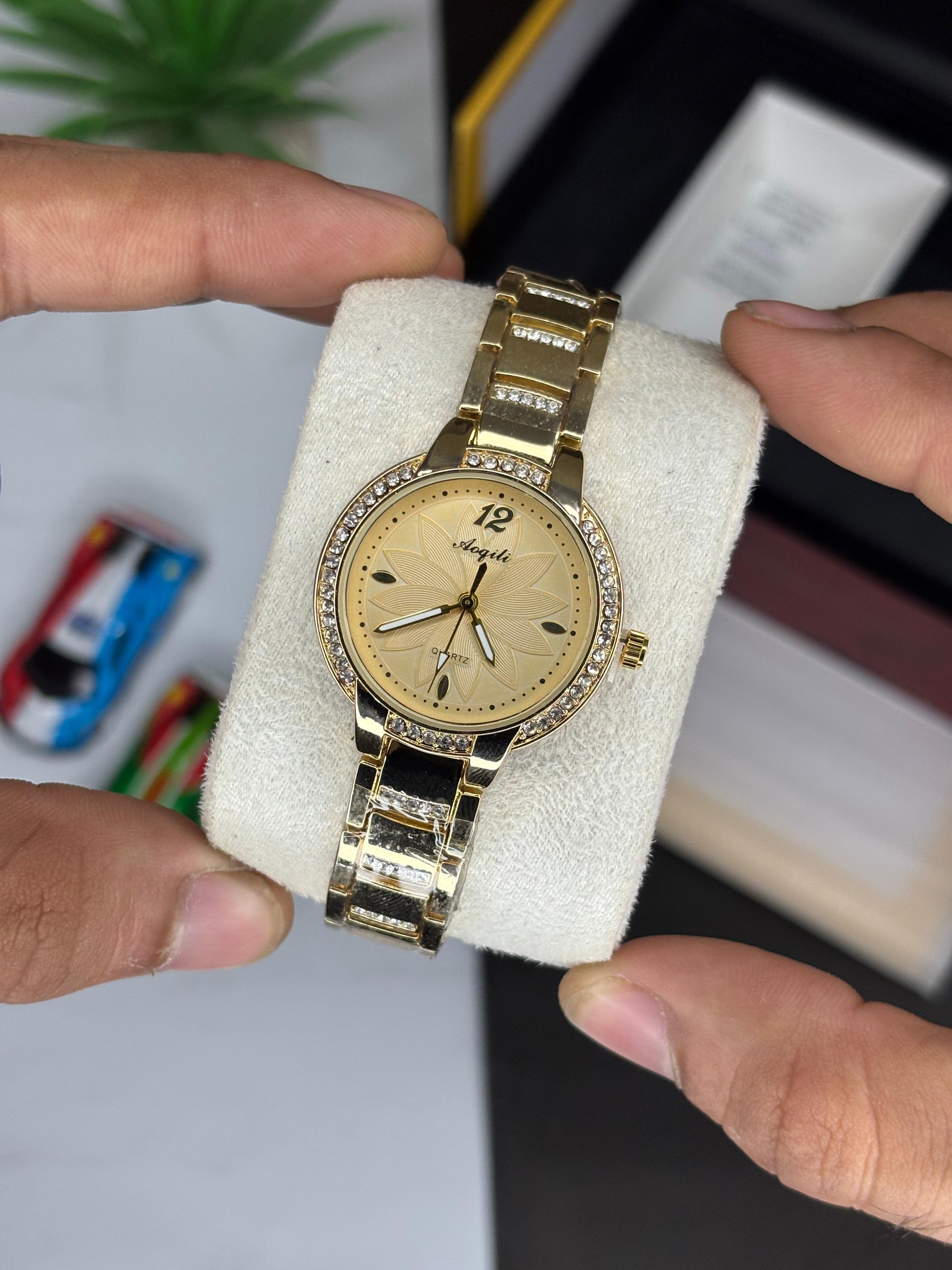 Elevate your elegance with the AOGILI Golden Ladies Watch, featuring a finely crafted golden chain that complements its sophisticated design. This timepiece combines timeless style with quality craftsmanship, making it a perfect accessory for refined occasions. Its durable chain ensures comfort and lasting wear, exuding grace with every glance.