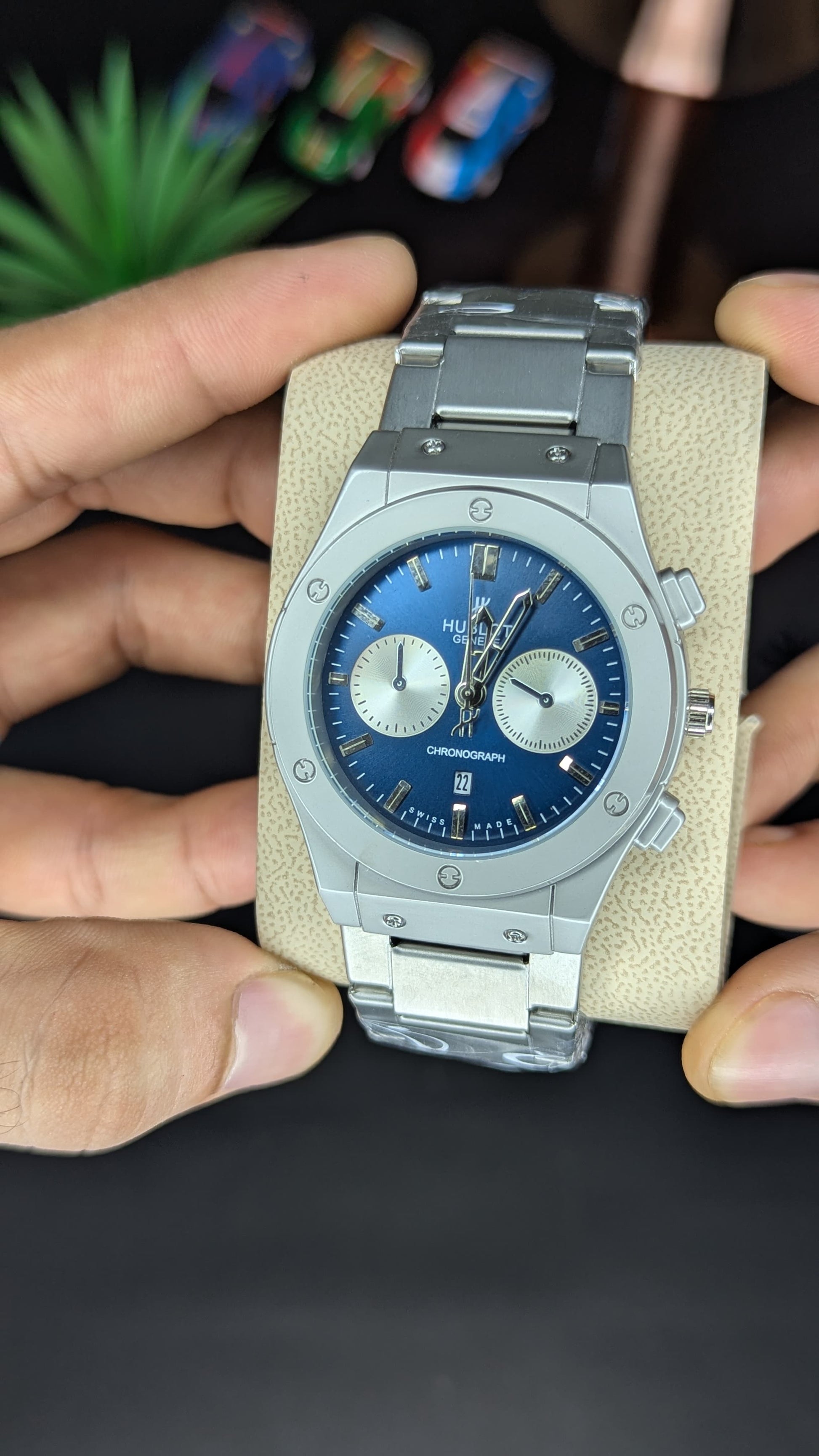 Elevate your style with the HB Stainless Steel watch, featuring a sophisticated navy blue chronograph dial and a substantial 42mm case. Crafted from fine-quality stainless steel, this heavy-weight timepiece (approximately 180 grams) offers durability and a refined matte finish. The butterfly lock chain ensures a secure and comfortable fit, making it an ideal accessory for those who appreciate both elegance and functionality.