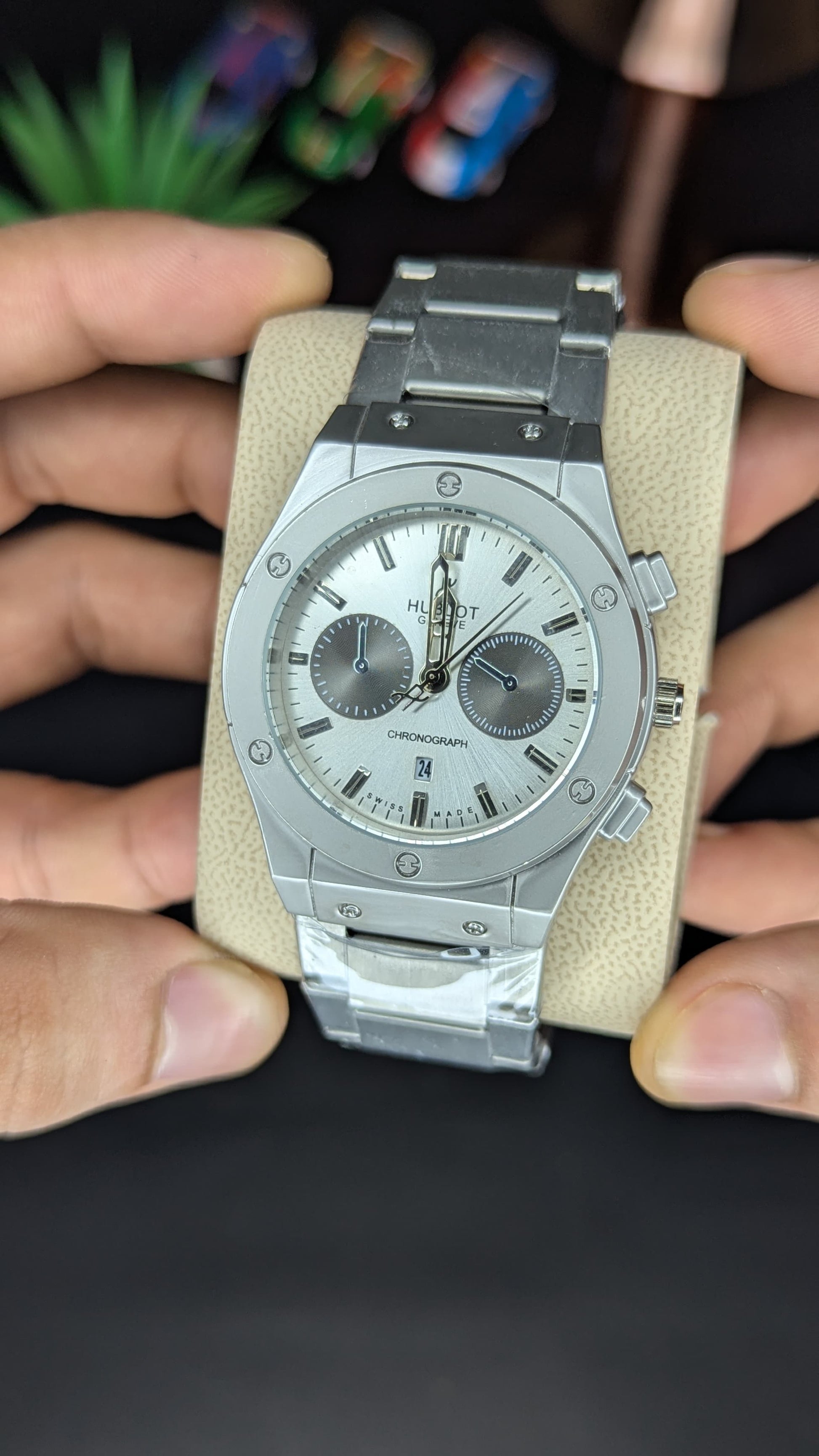 Elevate your style with the HB Stainless Steel watch, featuring a sophisticated White chronograph dial and a substantial 42mm case. Crafted from fine-quality stainless steel, this heavy-weight timepiece (approximately 180 grams) offers durability and a refined matte finish. The butterfly lock chain ensures a secure and comfortable fit, making it an ideal accessory for those who appreciate both elegance and functionality.