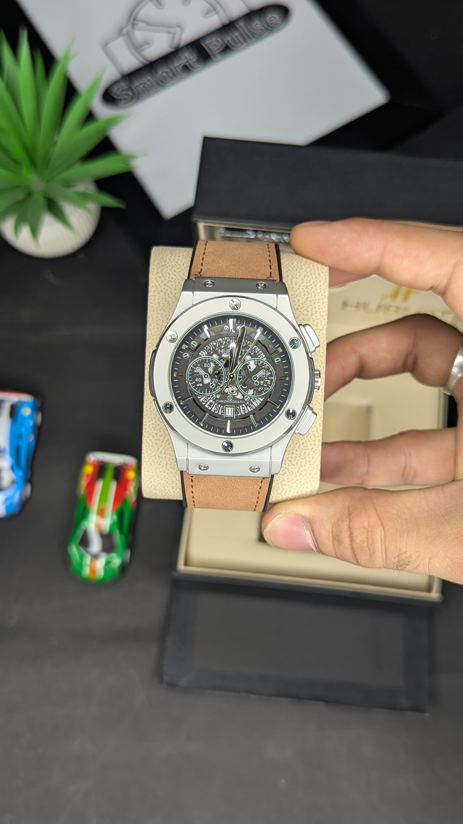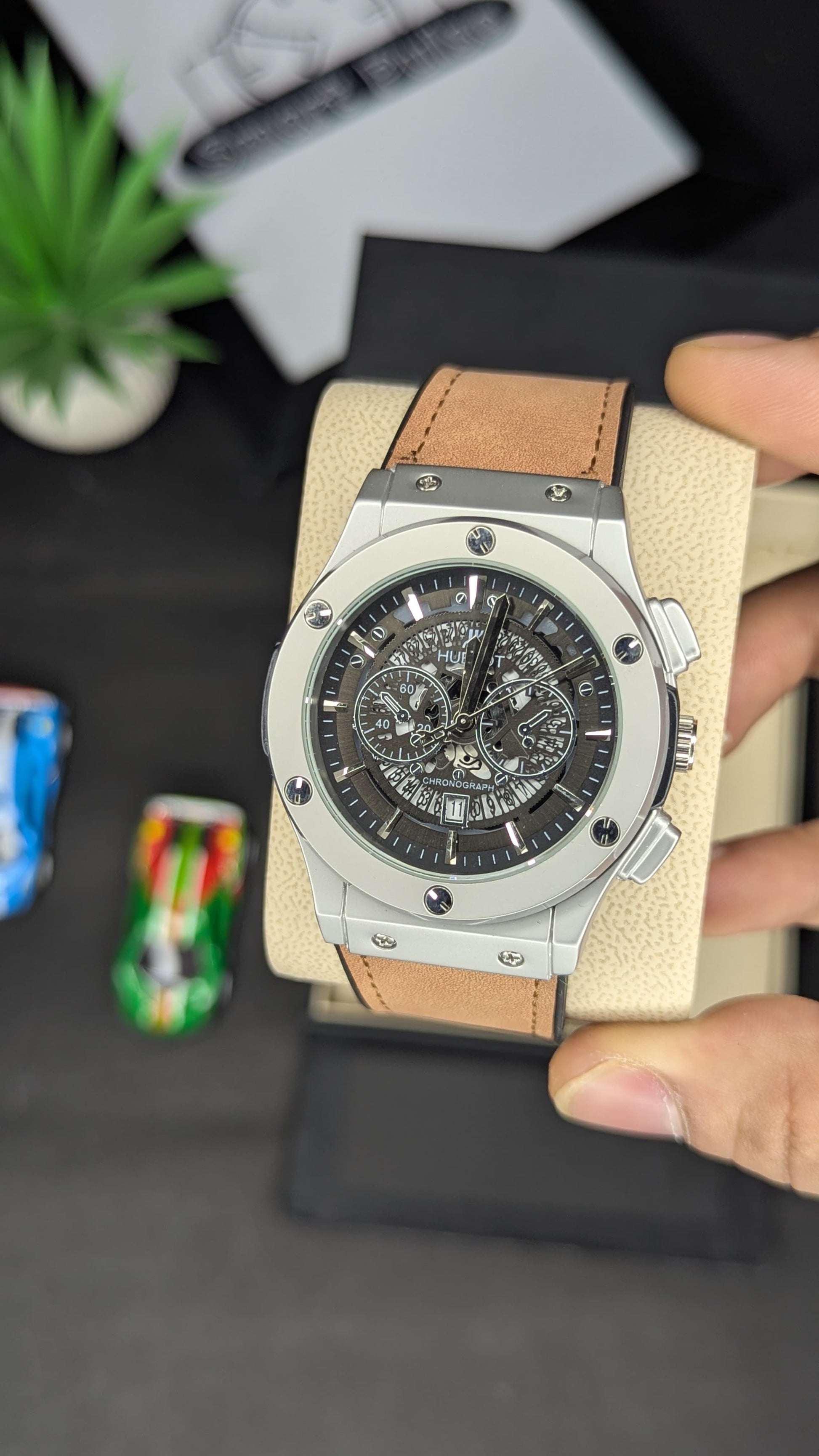 Experience precision timekeeping with the HB CHRONO, featuring a sophisticated chronograph function and date display. The elegant brown straps complement the distinctive HB design, secured by a premium master lock adorned with the iconic HB logo. Meticulously crafted for discerning collectors who appreciate exceptional quality and refined aesthetics in their timepieces.