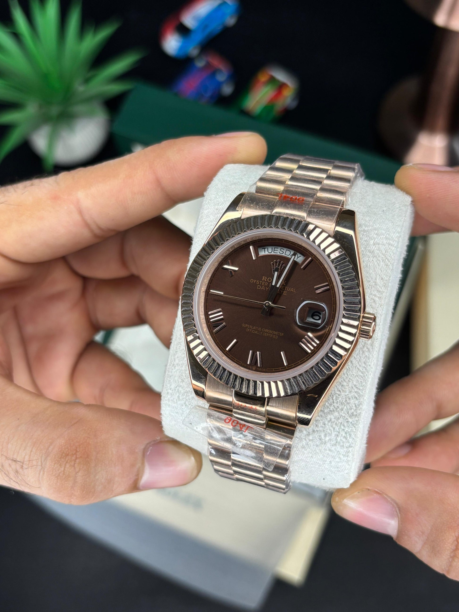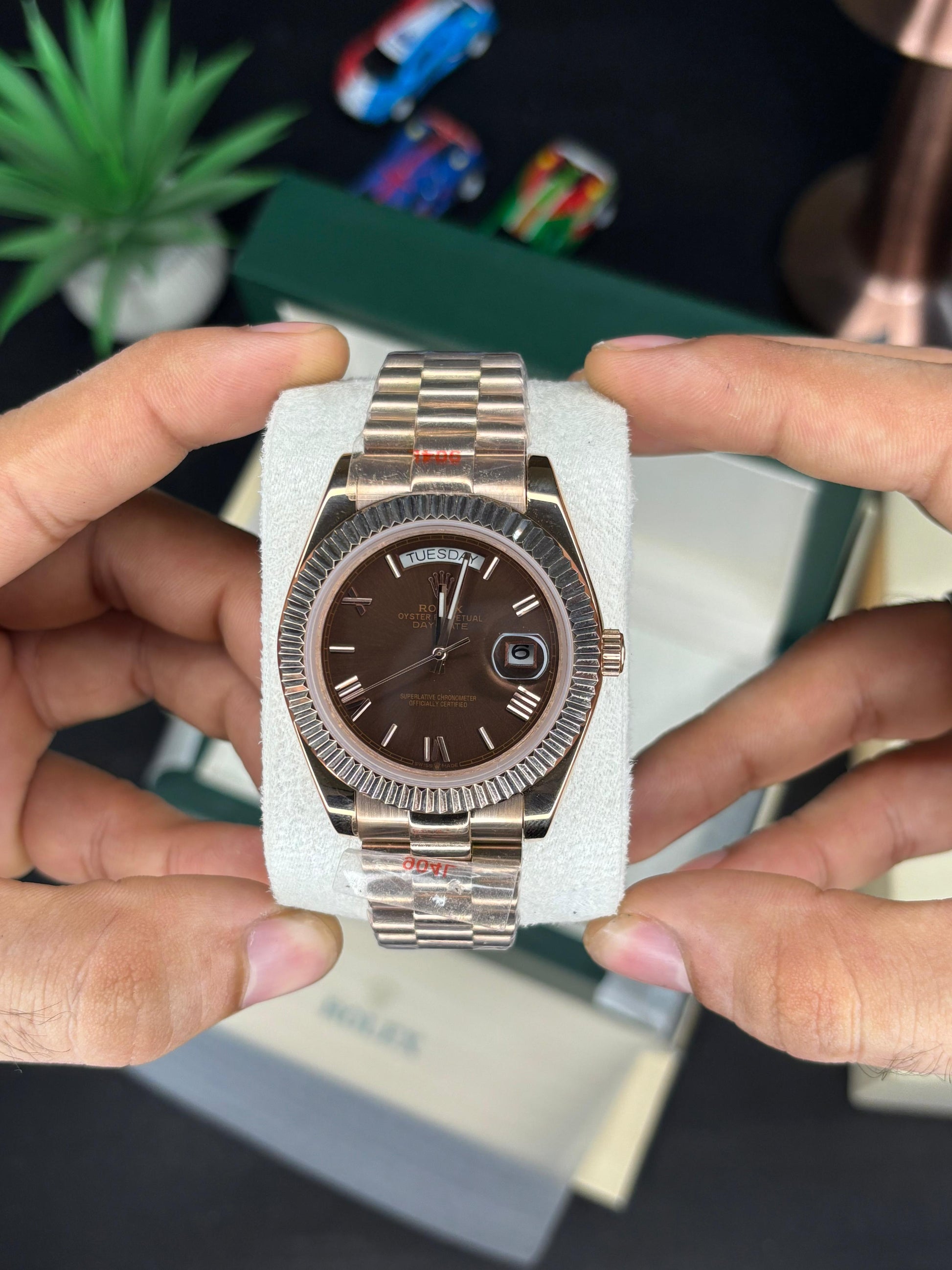 The RLX Rosegold Day-Date blends timeless elegance with exceptional craftsmanship. Featuring automatic movement and precise day-date functionality, this masterfully finished timepiece showcases classic Roman numerals on its dial, making it a distinguished choice for the discerning wearer. Renowned for its superior quality, it effortlessly combines reliability and refined style in one of the most sought-after watches worldwide.