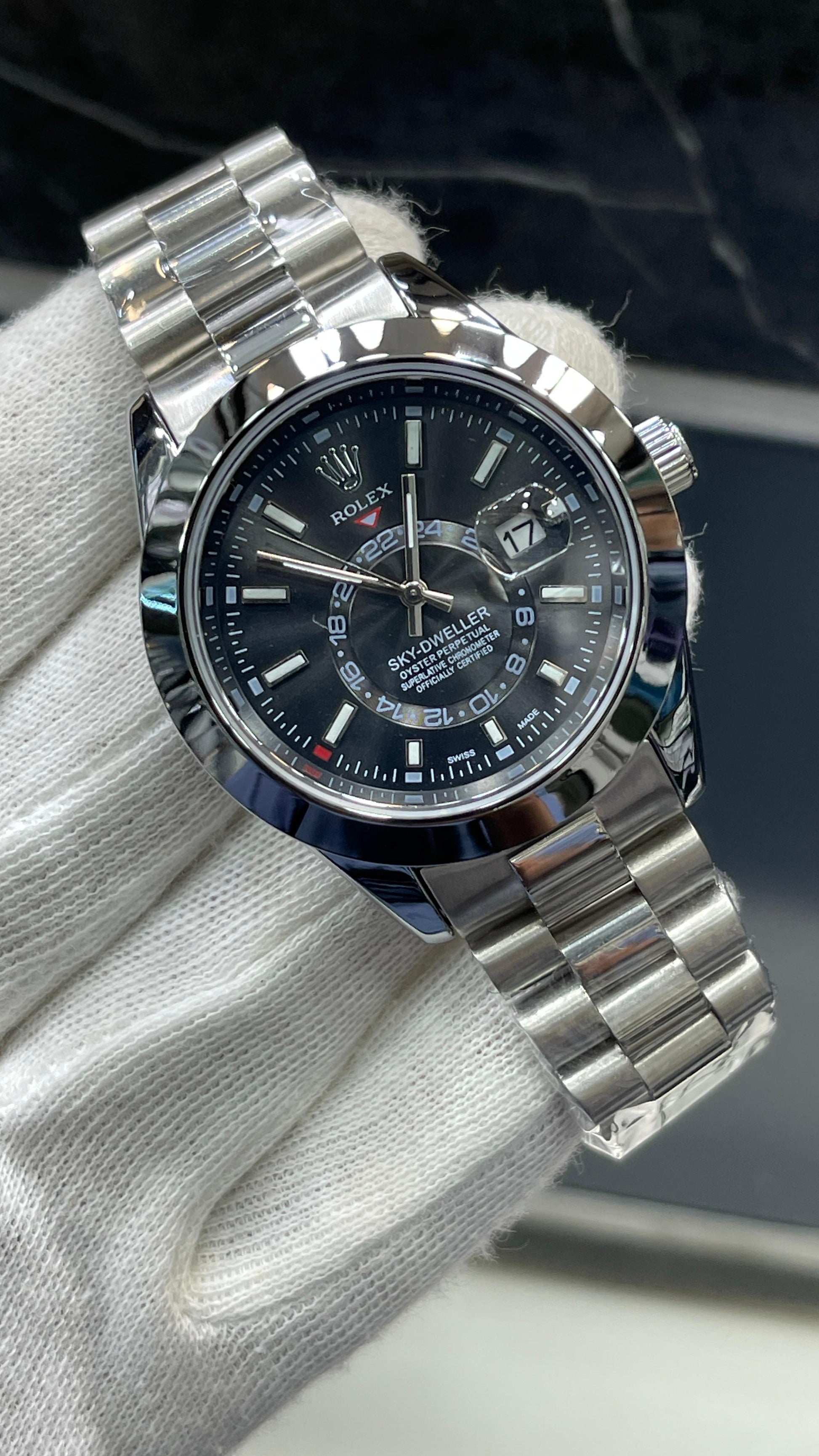 Elevate your style with the exquisite RLX SKY DWELLER. Featuring a fine quality black dial and a prestigious chain, this watch exudes sophistication. Its date function adds practicality to its luxurious design, making it the perfect accessory for any occasion. Upgrade to the world of luxury with the RLX SKY DWELLER.